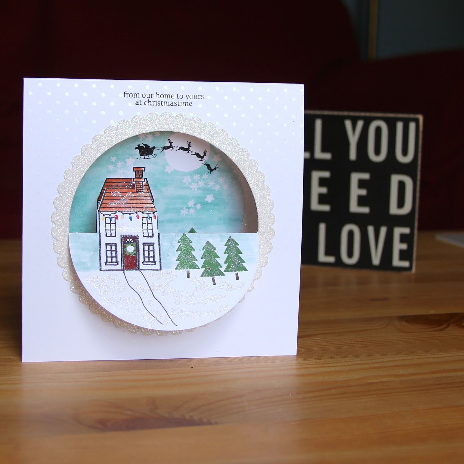 Our challenge this fortnight was set by Kate and she asked the Christmas Card Club ladies to make a card with a Christmas Scene. Well mojo left me on this one, but eventually today I've made this card and whilst I'm thrilled that I worked my Big Shot and Stampin' Up! dies to create a flip image in the middle and some depth, I'm not entirely happy with the card, but I don't want to let my fellow club members down and so here it is. I've used the retired set Holiday Home and the matching framelits Homemade Holiday and then used marker pens and a blender pen to add colour. I also embossed some snowflakes and stars from the set with clear embossing powder to make them 'pop' when I used the blender pen to add the sky. Please do visit the other ladies in our club, who I know will have had lots more success with this challenge.