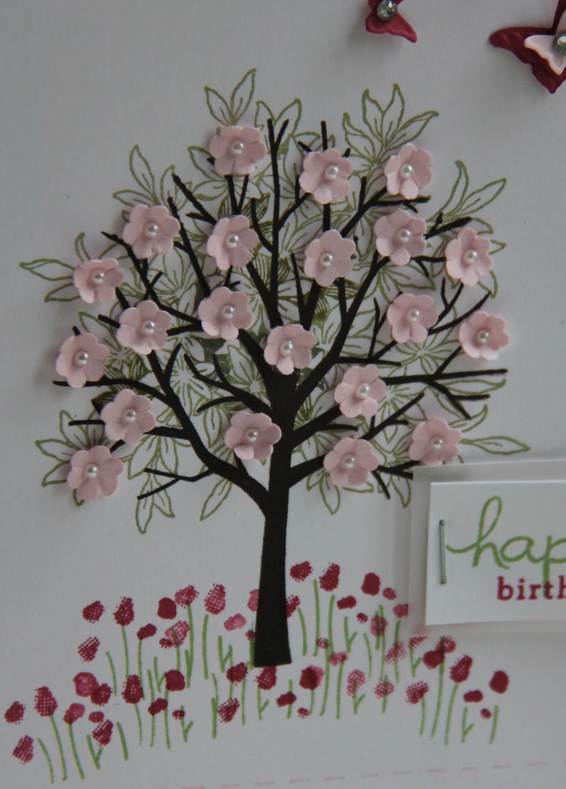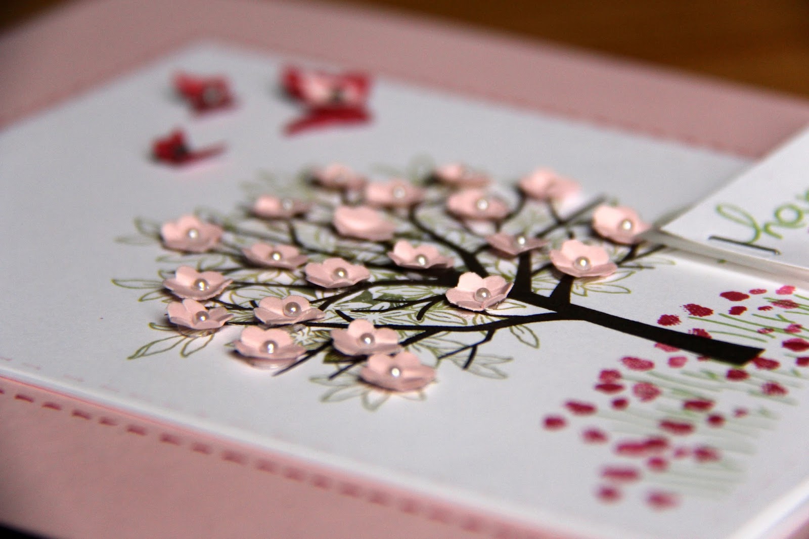A touch of vellum under my sentiment banner from Endless Birthday Wishes continues the theme of delicate and soft and the grass and flower heads were in this part of Sheltering Tree.  A ruler and marvellous marker allows you to add faux stitching in shades of pink pirouette and rose red and lots of tiny pearls for those that my Mum has freely given in the form of wisdom throughout my life.
