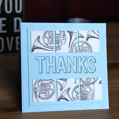 The card is done with soft sky, early espresso and very vanilla and uses retired Stampin' Up! stamp set Musical Medley and the recent Saleabration set  For Being You.  Although not ever so clear in my quickly taken picture this morning, there are versa mark musical markings on the base layer and then I created two triptych style borders with the French Horn stamp.