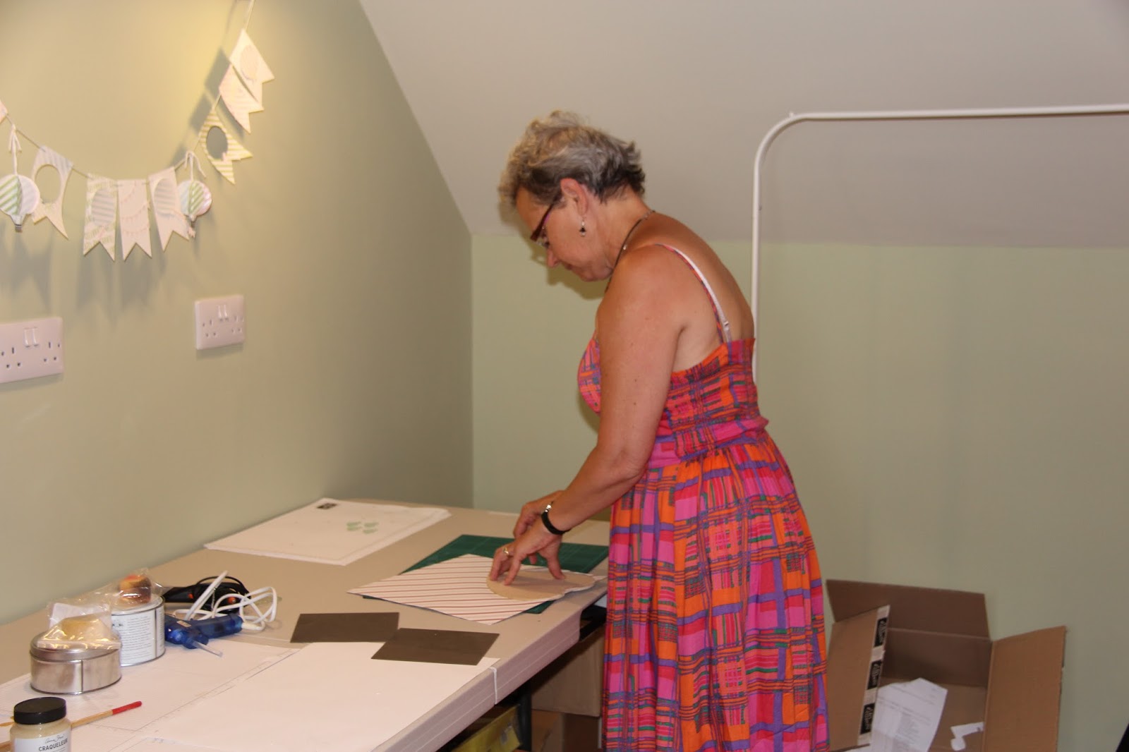 Earlier this week I hosted my monthly card club in my craft loft.  We made two cards and a gift bag with the new to Stampin' Up! UK gift box punch board.  Aren't these colours gorgeous in the Bohemian Designer Series Paper! The pack includes Bermuda Bay, Blackberry Bliss, Island Indigo, Delightful Dijon, Rich Razzleberry and Very Vanilla.  The paper coordinates with a Bohemian card stock pack which includes 8 sheets each of three coordinating colours including Bermuda Bay, Delightful Dijon and Rich Razzleberry.   There's also an embossing folder Boho Chic and a stamp set Bohemian Borders for you to build up some amazing patterns and colour combos.