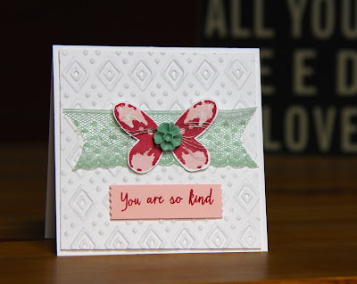 Last week I shared a couple of the projects from my monthly card club and promised I'd be back with more.  This was another card we made using Stampin' Up! set Watercolour Wings.  I love these colours of pink pirouette, rose red and mint macaron. This gave me a chance to use the new 'knicker' lace as I call it and share some lovely embellishments with my ladies.  The flower in the middle is from a set of 20 In Color Blossom Accents.  You can use them to decorate cards and other projects and could also turn them into earring studs to name but one project.