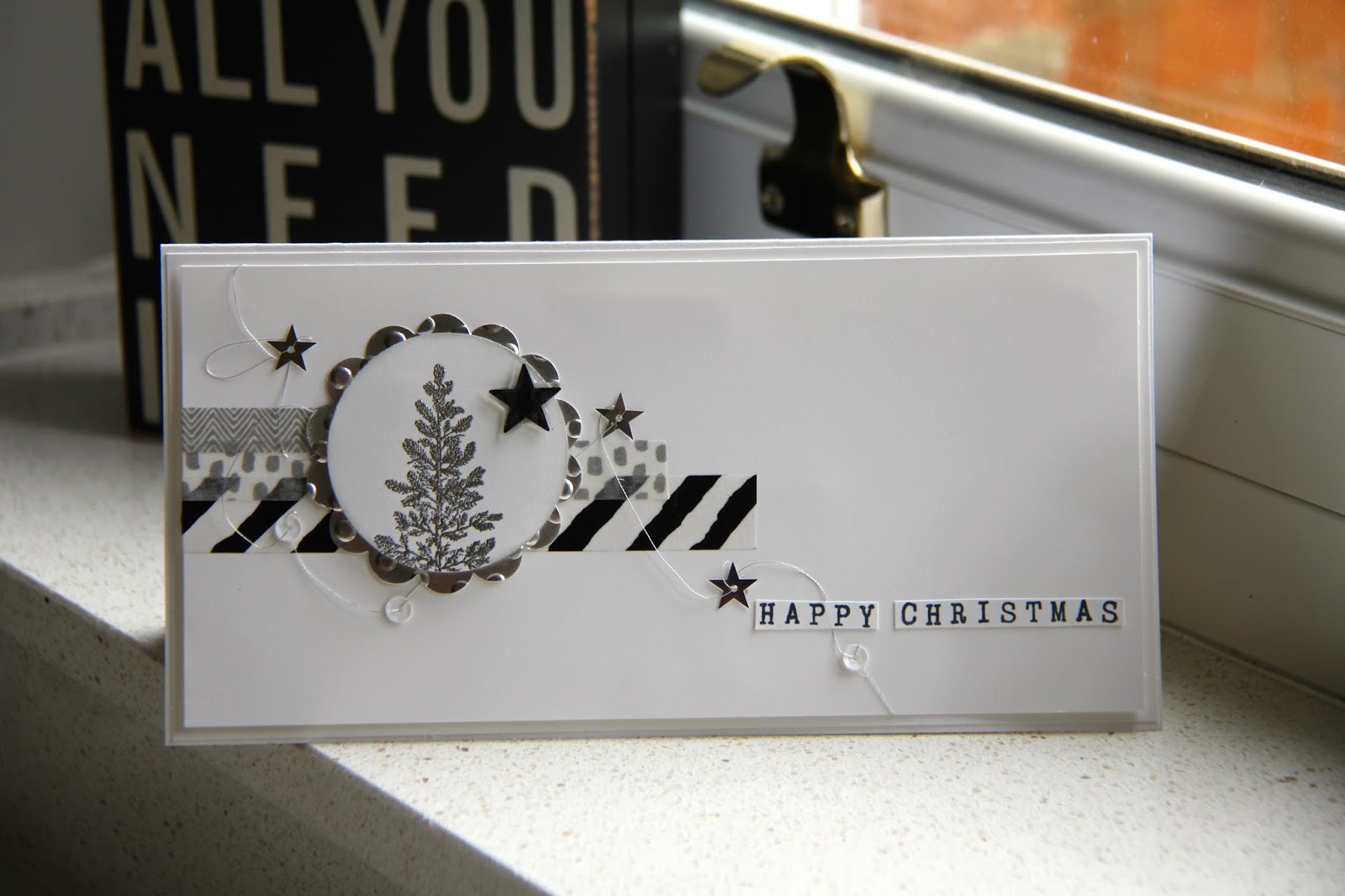 I embossed the lone fir tree top in silver and punched it out with the 2"circle punch and then 'smudged' the edge gently with smoky slate ink.  I matted it onto a scallop circle of silver foil card which I texture embossed with the decorative dots folder.  Everyday Chic washi tape made a simple background and I also added some of my lifetime supply (I ordered 5 rolls thinking it only had 4.5m per roll which in fact it has 45m per roll!) of silver thread on which I threaded sequins from the metallic assortment.