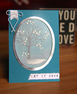 You know it's a bad day for taking pictures when it's raining, cloudy and the battery is flat in your camera!  However I've managed to get a picture of my card for Christine's challenge in our fortnightly Christmas card club.  'Let it snow' was the challenge and I've used a part of the Sheltering Tree Stampin' Up! set  and to create the sound along the ground one stamp from Work of Art.