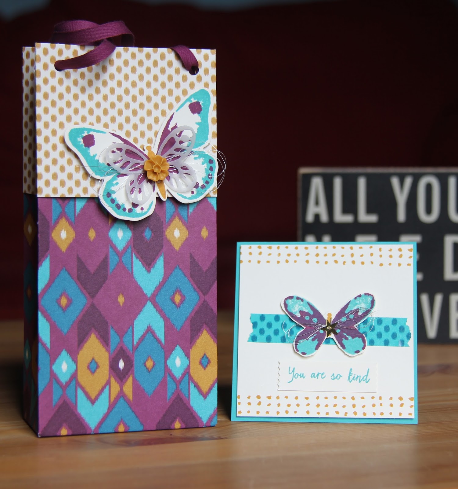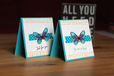 We also made a matching card and embellishment for the bag using the new Watercolour Wings stamp set which comes in photopolymer giving you a lot of stamps for your money.