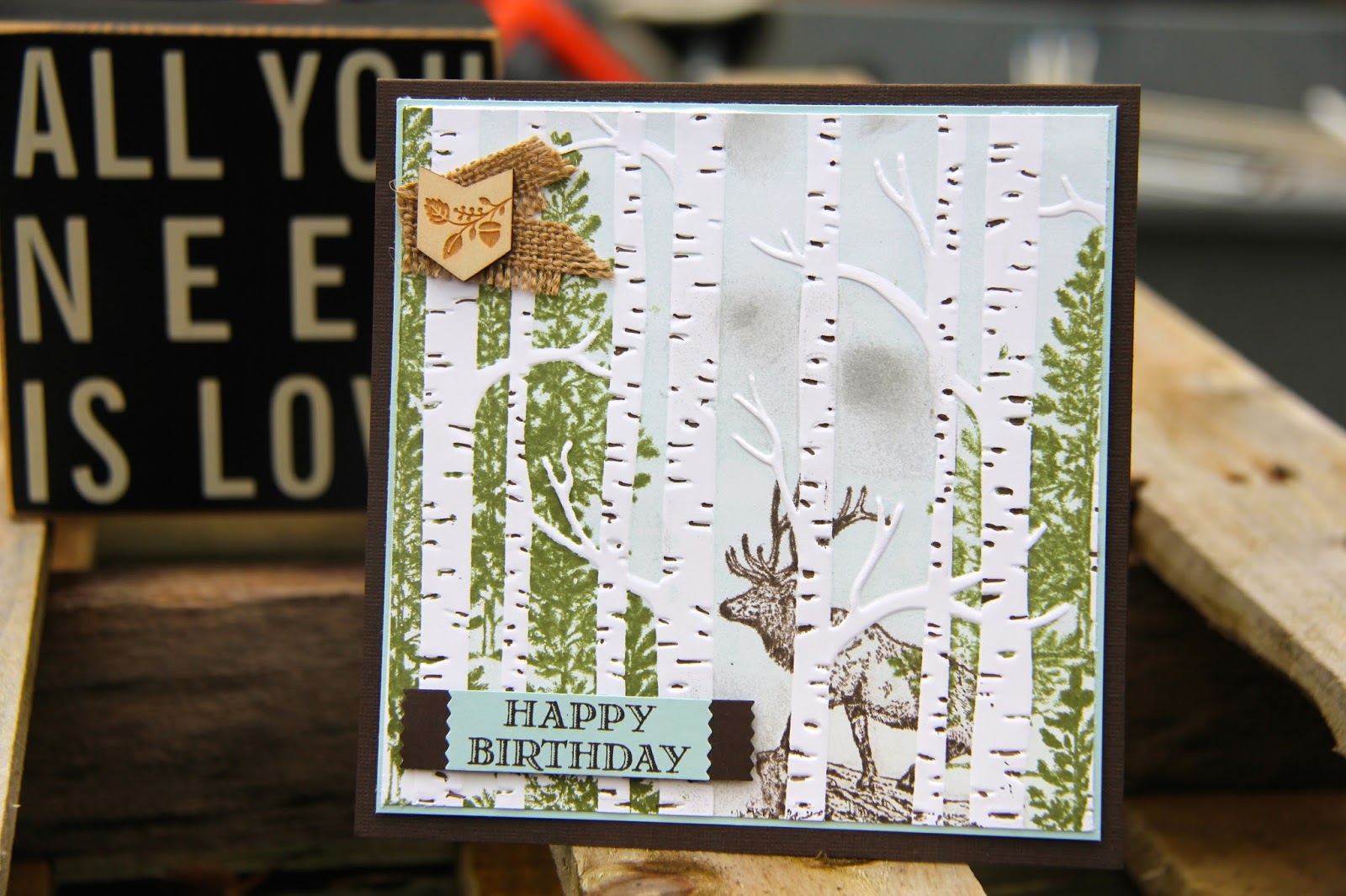 This lower version is good as a birthday card for men. The same process, but on this one I added some different embellishments ; some burlap and a wood element and I also 'smudged' some grey ink which could be clouds or smoke rising from the near by camp fire. A perfect combination of stamps for all those who love nature or indeed the hunting, shooting, fishing brigade.