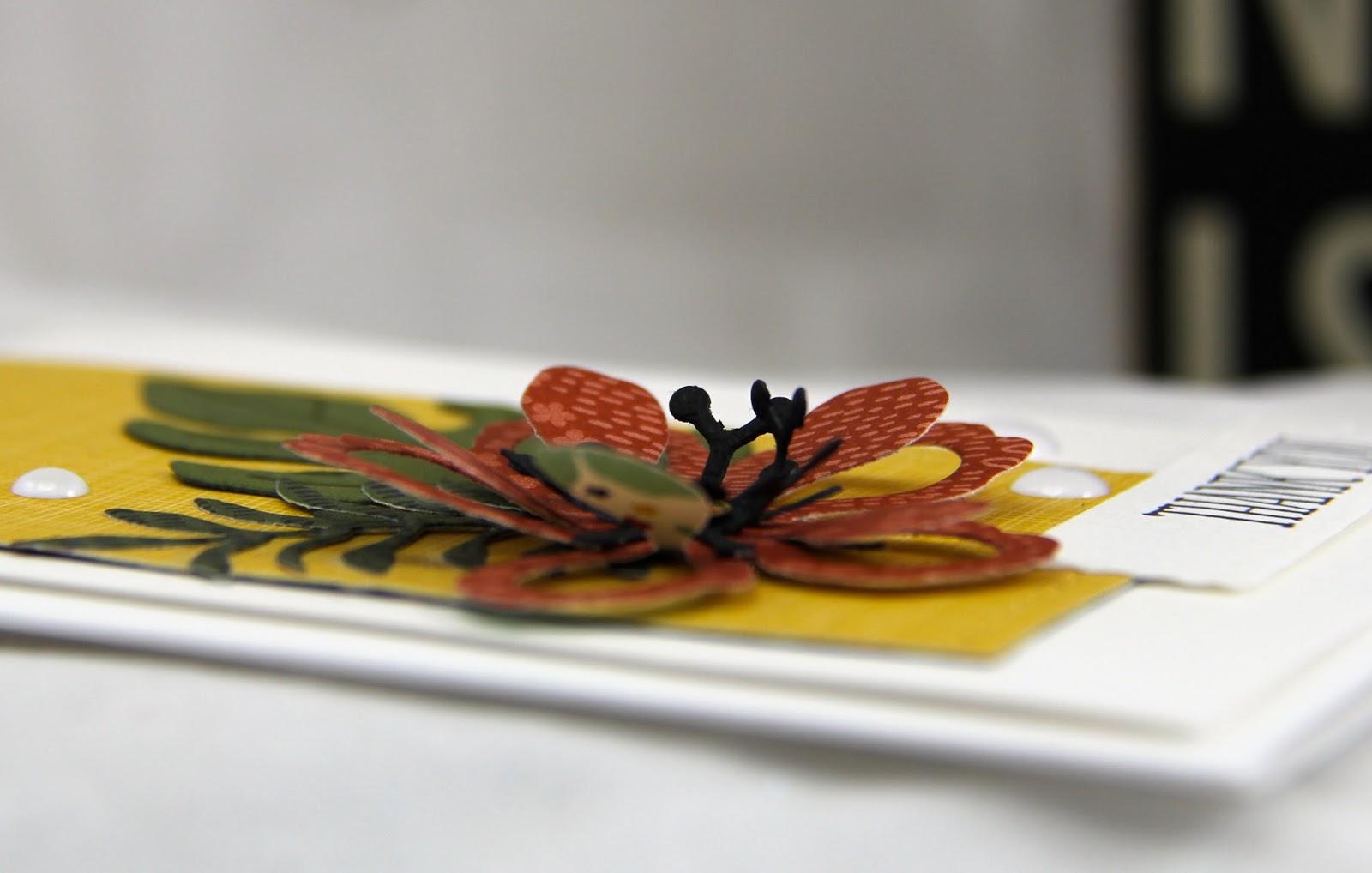 I like candy dots and am loving the white enamel dots for adding even more dimension and a little retired washi tape is great for attaching your topper. You can stamp leaves onto watercolour paper in order that you can spritz very gently with water to blend the colour on the them.