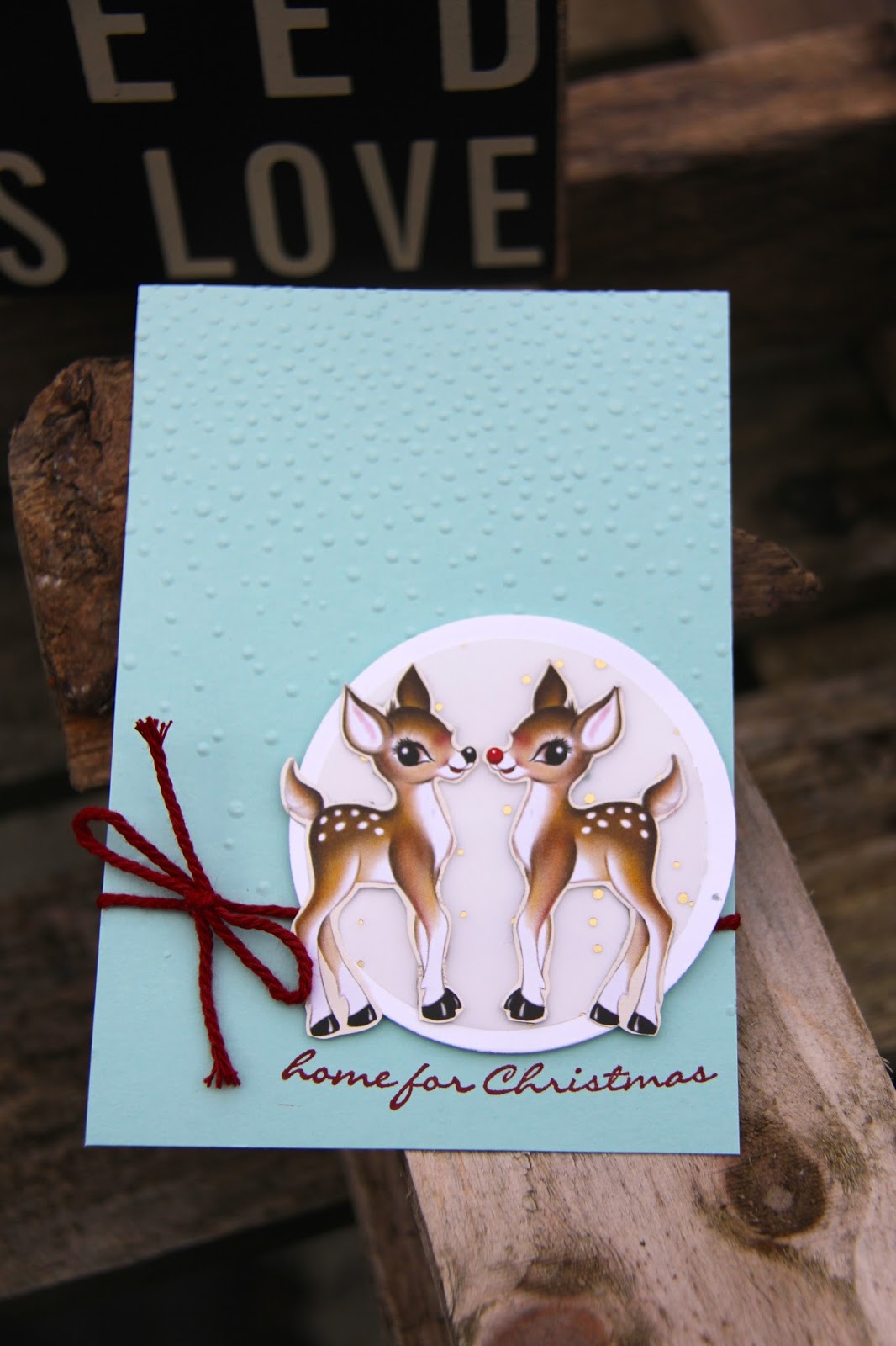 Stampin' Up! Home for Christmas designer series paper has been a big winner this autumn and that is largely due to the fabulous hand painted images that appear on many of the sheets of paper in the pack. These two cute reindeer are part of the ensemble and you can create fabulously stunning and yet simple cards just by cutting out images from the papers. I've popped Rudolph and his girlfriend onto a circle of Winter Wonderland designer vellum and then on a larger circle of whisper white card stock. This layered topper is then adhered to a an embossed base card in pool party. I've used the Softly Falling textured embossing folder from the Stampin' Up! winter catalogue to create a snowy background.