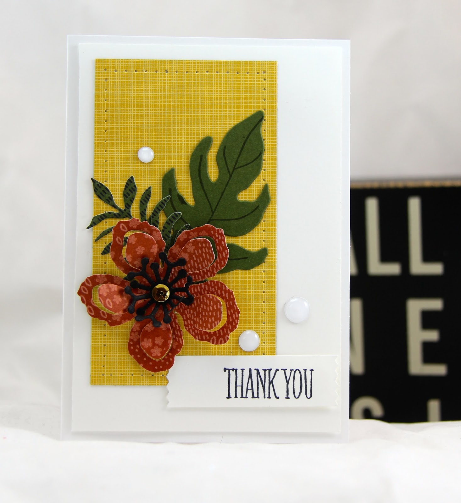 To fasten your vellum matting layer to your base card why not consider using a stapler which not only fixes the vellum in place, but it adds texture and stops you having to have glue marks under the vellum.