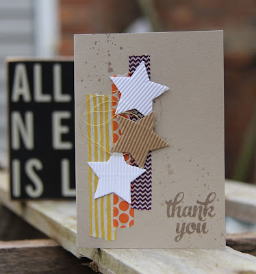 Today I'm enjoying life in Brussels at the Stampin' Up! new style convention which is now called Onstage Live. I'm here with some of my lovely team from the UK and The Netherlands and we are learning all about the new products coming in the Spring/Summer catalogue. Sorry no sneaky peeks as we aren't allowed to share just yet, but I can share one of my swaps with you. This simple card uses the star punch. I've used it with the corrugated card stock that comes in the Stampin' Up! annual catalogue and you get a sheet of white and sheet of kraft. Fab card for texture and it looks great mixed with the in colour washi tape, gold thread and little bit of stamping from Gorgeous Grunge and the thank you is from the Tin of Cards set, its the one that matches that gorgeous tin and card kit on the front cover of the annual catalogue.