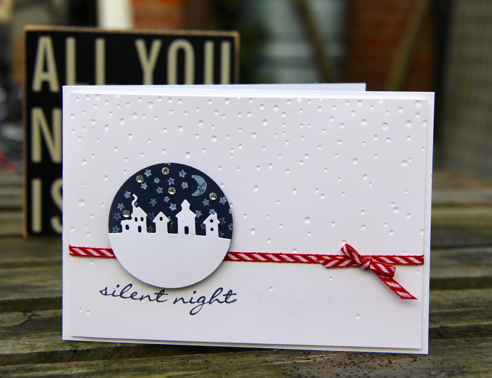 I've added a matt layer of red foil card and then a smaller circle of whisper white card which I've embossed with the Softly Falling Textured Impressions folder. My trio of trees are stamped in old olive ink using the annual catalogue stamp set Lots of Joy. Bling today is in the form of silver glimmer paper Merry and pie crust rhinestones along with a little silver thread. I've gone for wishes as I'm wishing for a special Christmas with my niece and nephews.