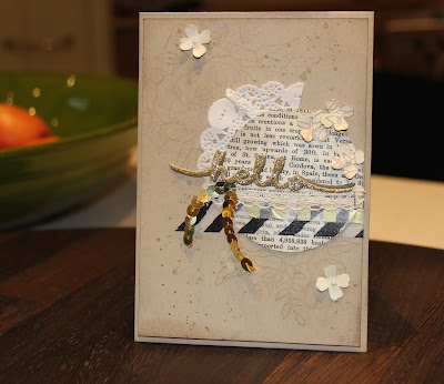 It's vintage in it's style with lace, newsprint and doily and it uses one of the new stamp sets from the upcoming Spring Stampin' Up! catalogue. Can you spot it?