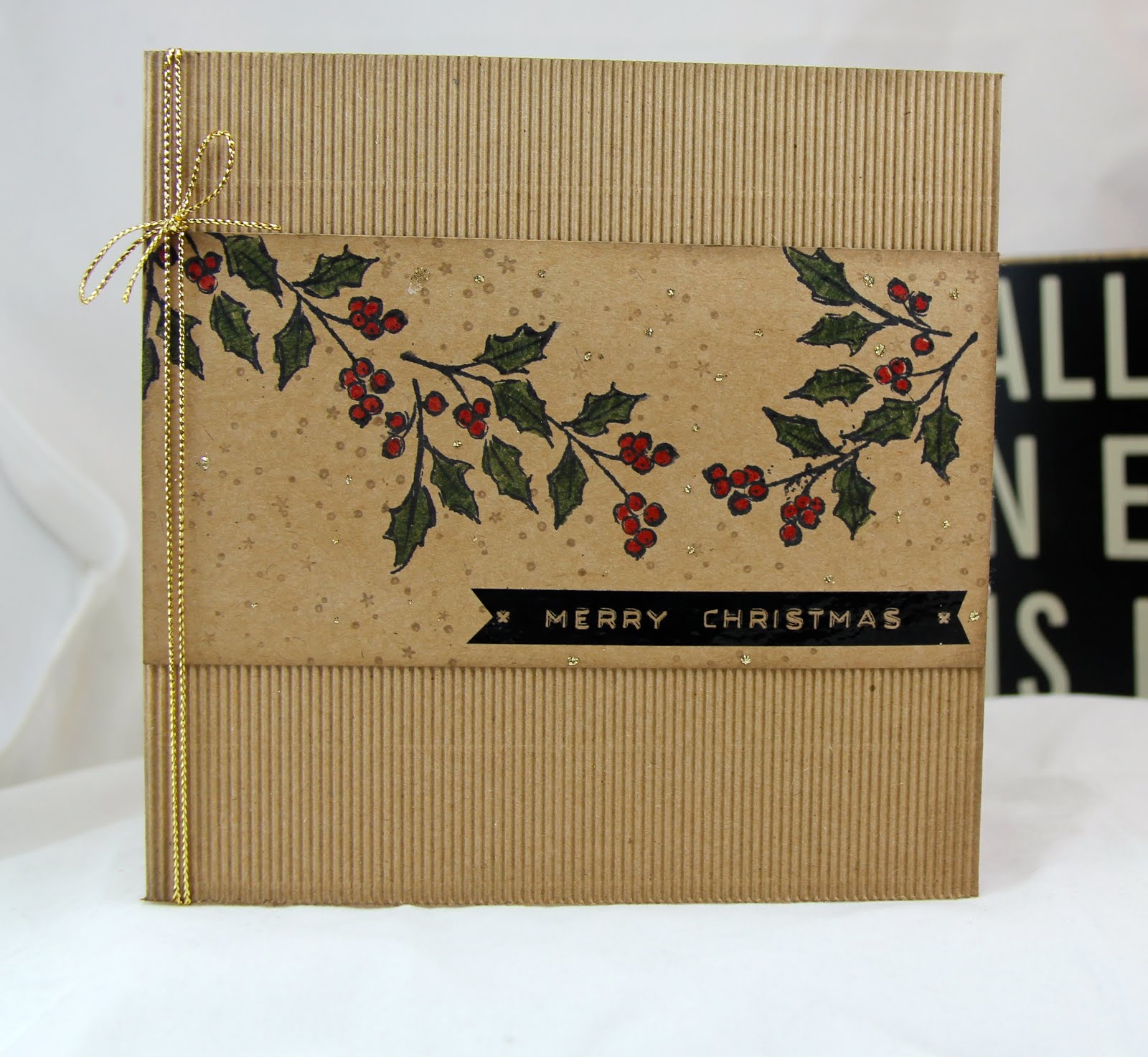 I've used my trusty retired Stampin' Up! set Watercolour Winter to simply stamp in black Staz On ink onto kraft card. I've coloured in the leaves and berries with mossy meadow and real red ink respectively. A little 'smudging' to soften the edges of my piece and the the base card made with kraft corrugated paper. I also stamped in tip top taupe, but second generation, having stamped off the small background stamp from Holly Jolly Greetings with dots and stars and I've also added some glitter using my fine tip glue pen to add just spots of glue before the glitter was sprinkled on top.