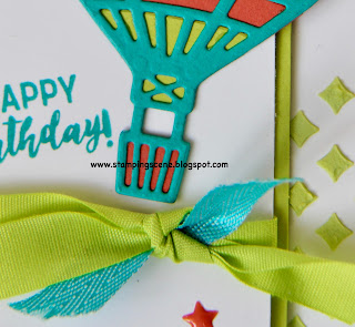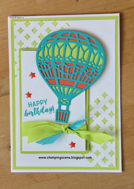 I love the hot air balloon die from Up and Away thinlets and with the individual dies included to cut different back ground coloured pieces you can make some gorgeous balloons in any colour way you wish. Here I've used bermuda bay, calypso coral and lemon lime twist.