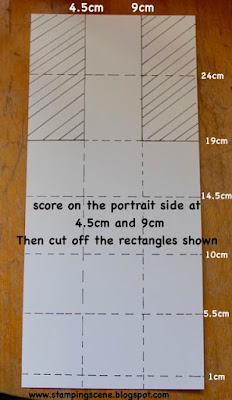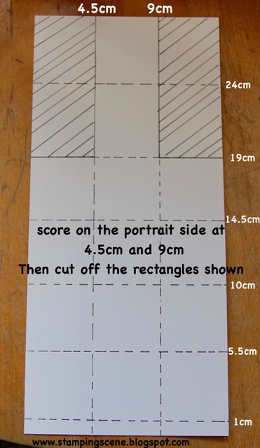 So first of all you need a piece of card stock cut at 13.5cm by 29.8cm (A4) and you can then score on the landscape side as shown.